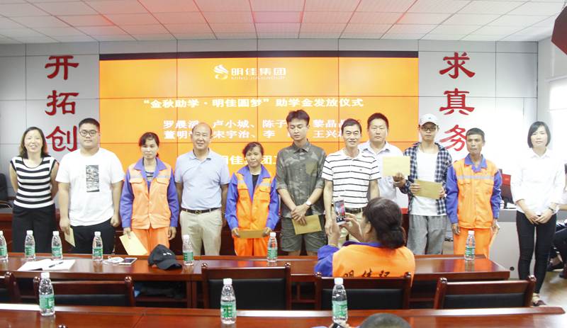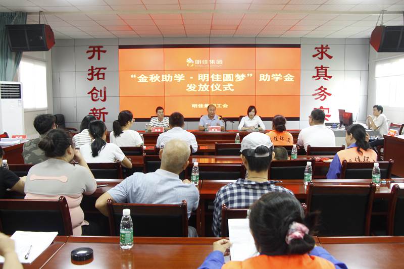 8月28日上午,明佳集團工會“金秋助學·明佳圓夢”助學金發(fā)放儀式在集團公司三樓會議室舉行,為8個考取大學的職工子女發(fā)放助學金共計9600元??偛藐愒?、副總經理鐘寒參加發(fā)放儀式,儀式由工會主席高斐斐主持。